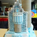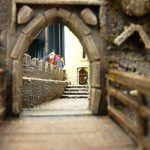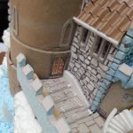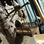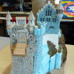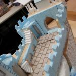 Eerder had ik al een kasteel gemaakt, waarbij ik een huisje overhield. Deze heb ik als basis gebruikt om verder op te bouwen. De berg en de kasteelmuren bestaan uit foam. Het stenen patroon op de muren is getekend met potlood waarna de groeven dieper zijn gemaakt.