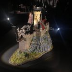 Na het kasteel te hebben geschilderd, heb ik modelgras en struikjes gelijmd op de grondplaat en rotsen.