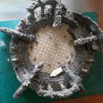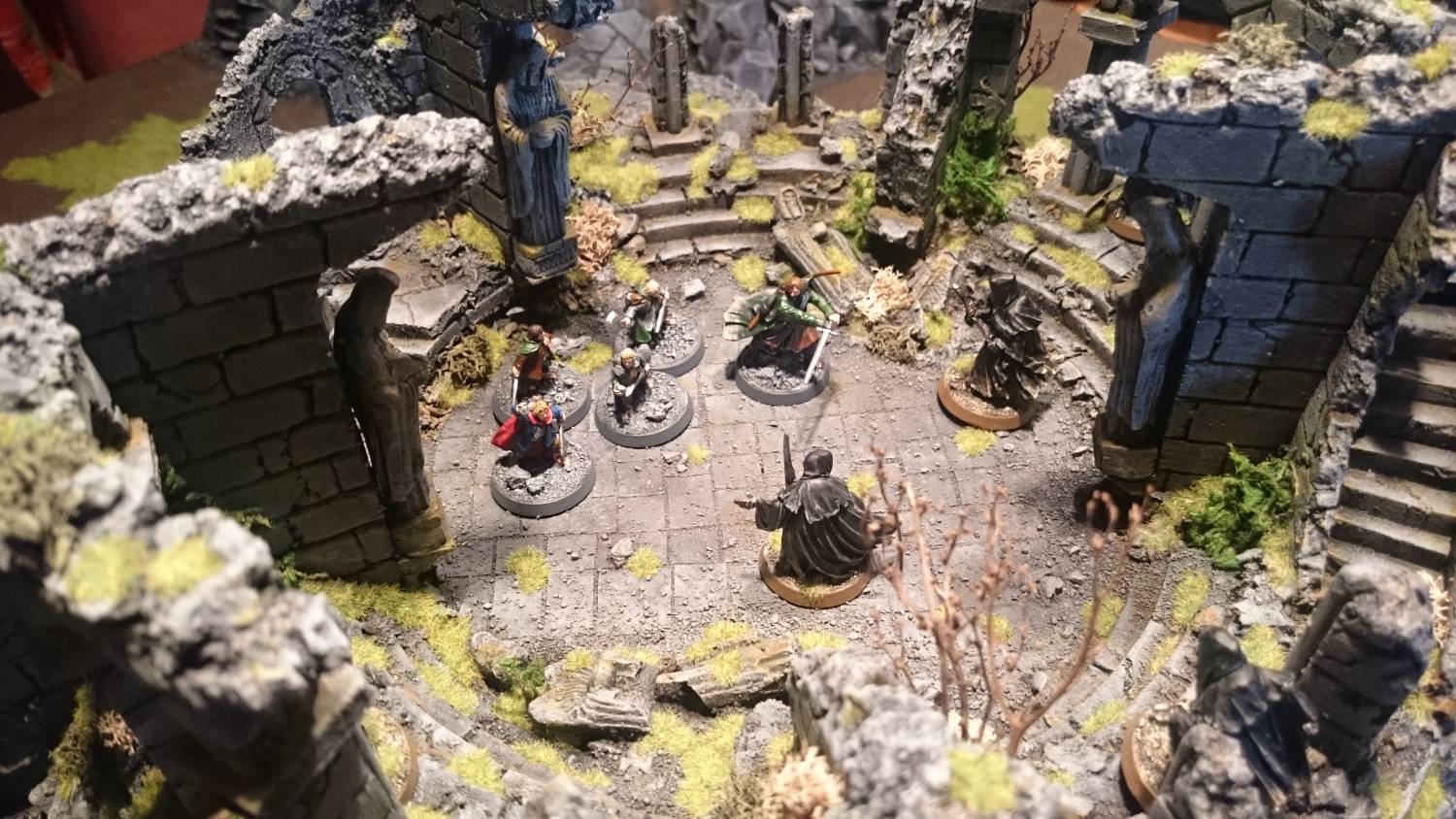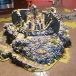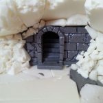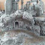 De ruïne zelf is opgebouwd uit dunne foamplaten. De standbeelden komen uit het bordspel Middle-Earth van de Games Workshop. Ook hier heb ik een tang gebruikt om de afgebrokkelde muren te maken.